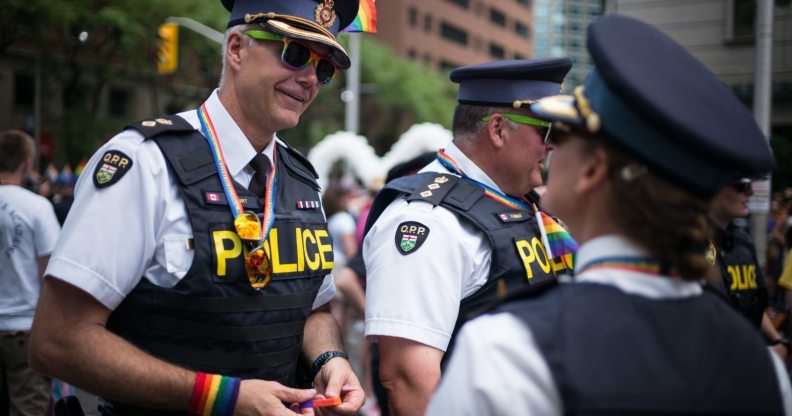 TORONTO, CANADA – JULY 3: Ken Leppert (L) of the Ontario Provincial Police, speaks with colleagues at the annual Pride Festival parade, July 3, 2016 in Toronto, Ontario, Canada. Prime Minister Justin Trudeau will make history as the first Canadian PM to march in the parade. (Photo by Ian Willms/Getty Images)