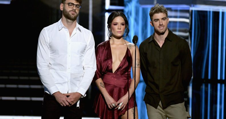 LAS VEGAS, NV – MAY 20: Recording artists Alex Pall (L) and Andrew Taggart (R) of The Chainsmokers and Halsey (C) speak onstage during the 2018 Billboard Music Awards at MGM Grand Garden Arena on May 20, 2018 in Las Vegas, Nevada. (Photo by Ethan Miller/Getty Images)