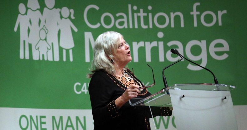 Former MP Anne Widdecombe speaks at an anti-LGBT Coalition for Marriage fringe event, as part of the Conservative Party Conference close to the International Convention Centre on October 8, 2012 (Photo by Matt Cardy/Getty Images)