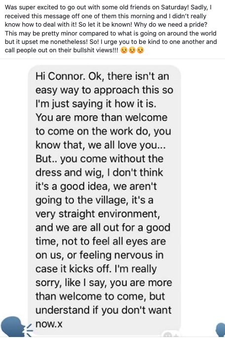 Connor Wilson was stunned after friends were transphobic towards her, who sought to apologise for taking “people’s feelings into consideration”. (Facebook)