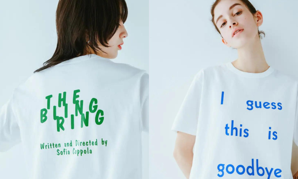 The t-shirts for Lost in Translation and The Bling Ring feature quotes from the films, with “I guess this is goodbye” and “Let’s go shopping”, with the back of the tees featuring the film title and “written and directed by Sofia Coppola”.